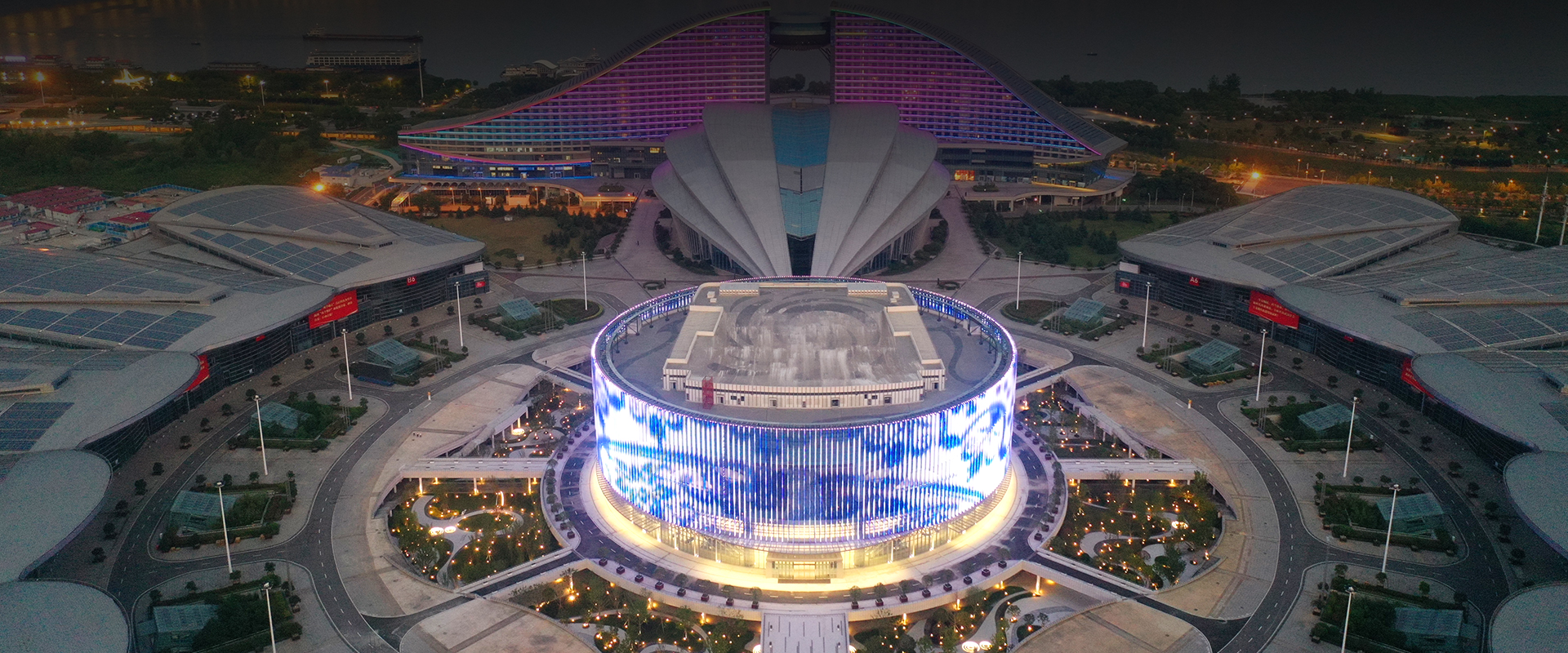 武漢國博會展中心提升工程-漢廳 國際一流的會議中心,為武漢城市會客廳,采用勇電LED燈光,聚焦博覽城中心,突顯地標建筑夜景。